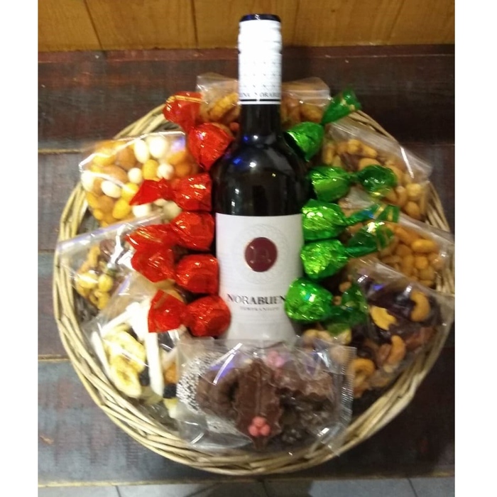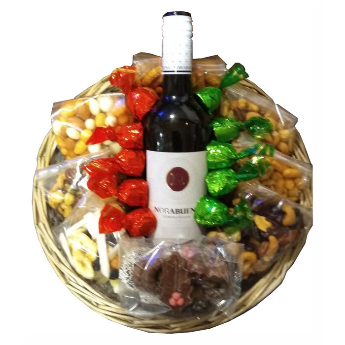 200 gram gemengde noten, 200 gram cranberry mix, 200 gram pistache mix, Japanse mix, borrelnootjes, 250 gram Jakarta pinda's, 150 gram cranberry fruitmix, 100 gram chocolade, 10 kersen of hazelnoot bonbons